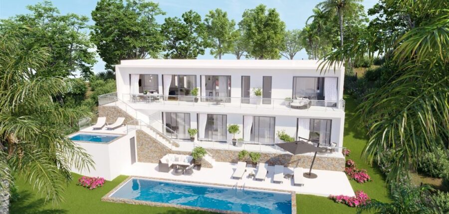 Beautiful fenced modern built villa of 450m2 on a plot of 1088 m2 in Cala Tarida in a beautiful location overlooking the forest. It is only 350 meters walk to the beach, it is located in the urban area. The beautiful villa has 5 bedrooms with private bathrooms.