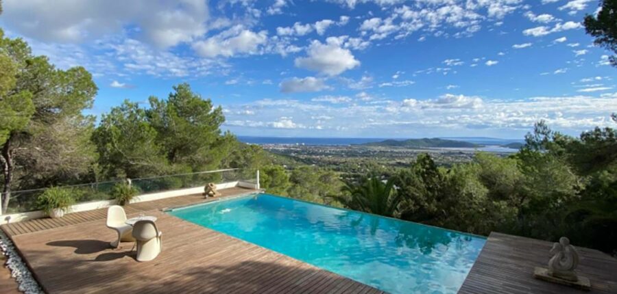 This unique villa is located on a hill in a very private setting and offers incredible panoramic views over the sea and the countryside. The main house consists of two en suite bedrooms upstairs and two more bedrooms accessible from the outside.